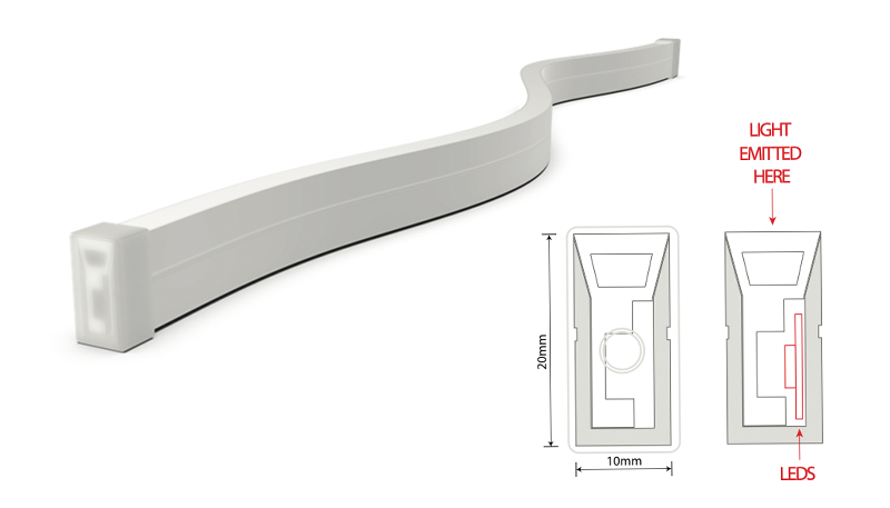 Our M-LINEAR-FLEX-1020 is a flexible silicone fixture which projects an even continuous light making it perfect for both decorative illuminated curves as well as for conforming to a curvature around a corner or freeform headboard contour. Available in other profiles as well.